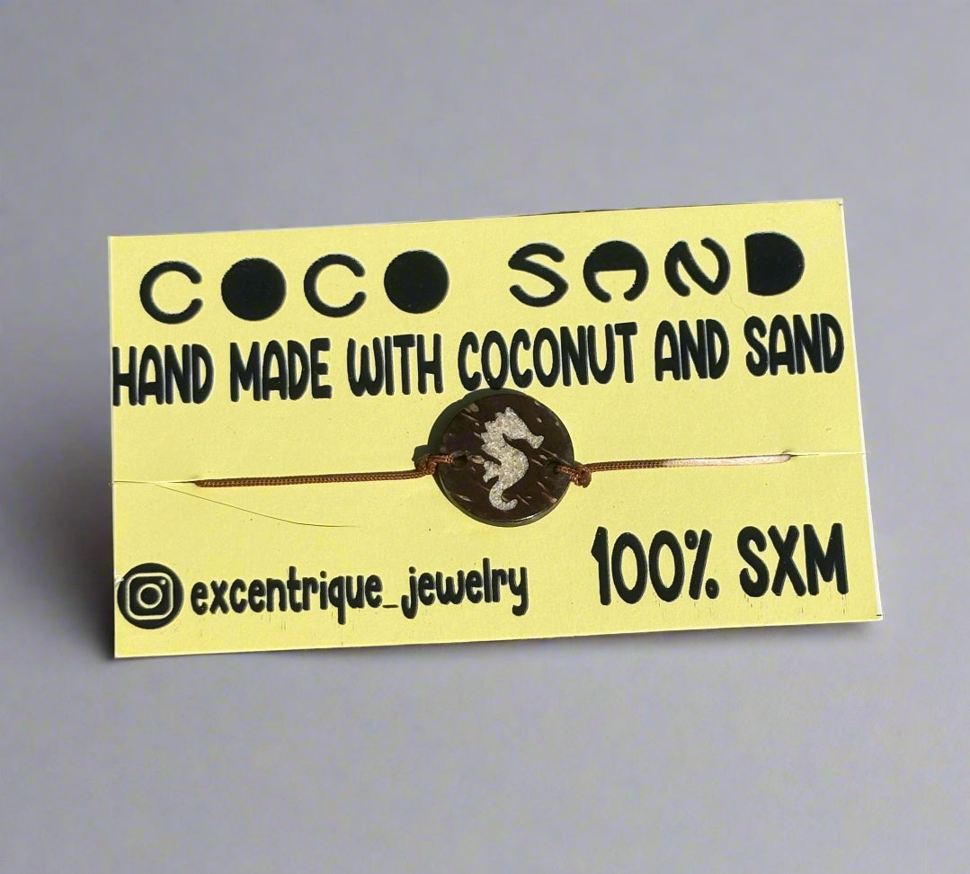 Delicate yet full of character, our COCO SAND seahorse anklet is handcrafted in St. Maarten with real coconut shell and natural beach sand. The seahorse is a symbol of grace, patience, and quiet strength—making this anklet a perfect piece for ocean souls and free spirits.